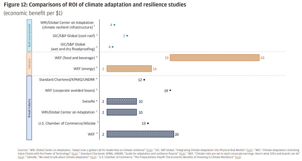 Climate adaptation, often framed as a risk management decision, is increasingly recognized as a strategic advantage to build resilience. Companies have taken different approaches, from early movers, cautious amortization, to the status-quo wait-and-see. The latter could lead to $1.2 trillion in annual losses for large corporates by the 2050s. But the narrative is shifting towards an upside opportunity. Markets are starting to reward it, and analysis shows returns from $2-43 per $1 invested in adaptation and resilience.